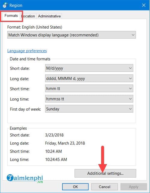 Bước 4: Và ở trong Region hãy chọn mục Format, nhìn xuống dưới cùng sẽ có phần Additional settings, hãy click vào phần này để tiến hành thiết lập đổi dấu phẩy thành dấu chấm trong Win.