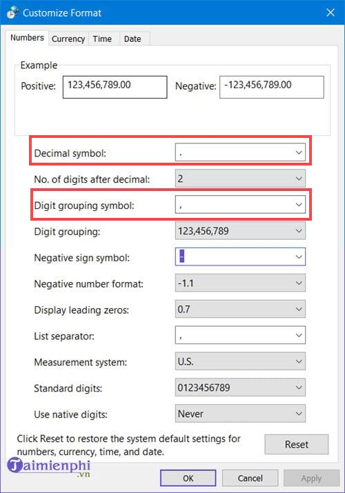 Bước 5: Tại trong này chúng ta sẽ thấy có 2 dòng là Decimal Symbol và Digit Grouping Symbol, để đổi dấu phẩy thành dấu chấm trong Win chúng ta phải chỉnh sửa 2 dòng này.